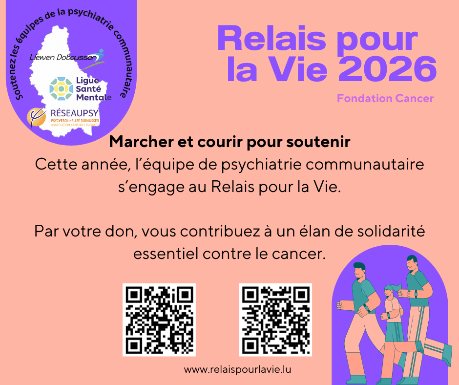 Le 21 et le 22 mars, Réseau Psy-Psychesch Hëllef Dobaussen fait équipe commune avec  l’asbl Liewen Dobaussen et la Ligue pour participer à l’édition 2026 du Relais pour la Vie. Ensemble, nous soutenons la Fondation Cancer pour l’aider à continuer dans leurs missions pour soutenir les personnes concernées et leurs proches: